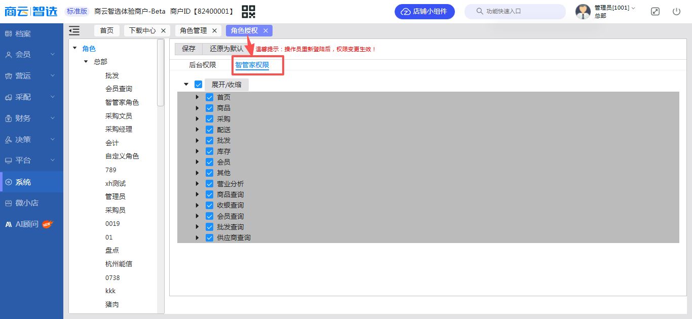 - 位置:商云|智选后台–【系统】->【用户管理】->【角色授权】