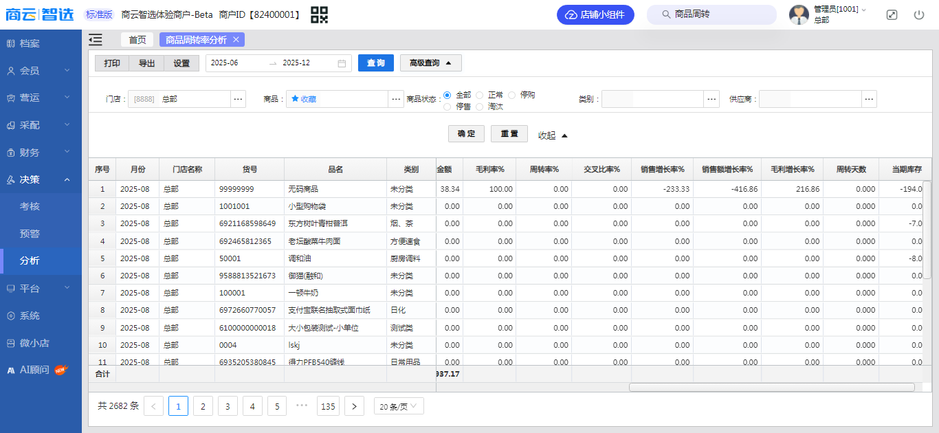 智选后台:【决策】->【分析】->【经营分析】->【商品周转率分析】