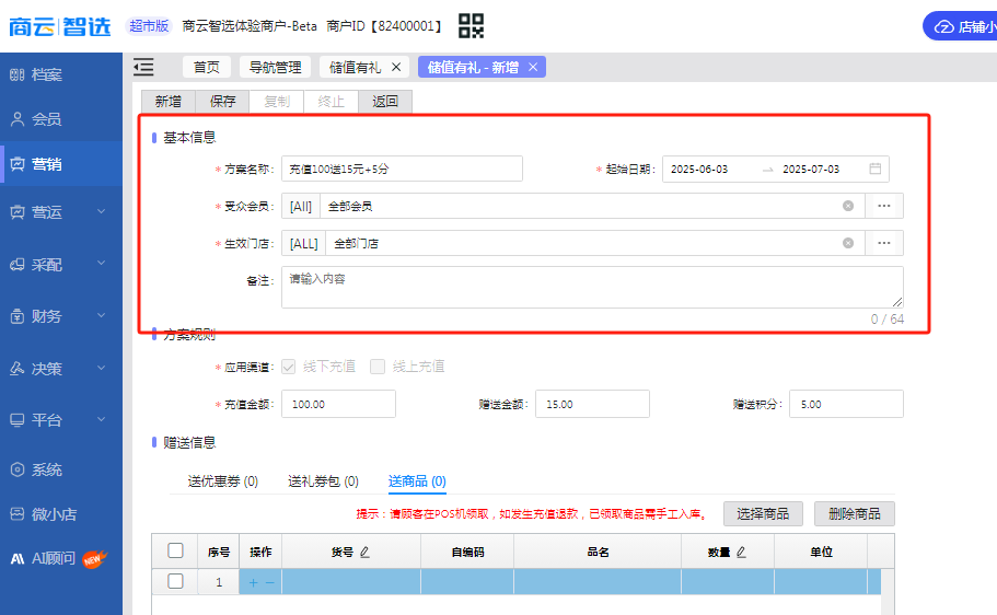 智选后台:【营销】->【营销活动】->【储值有礼】