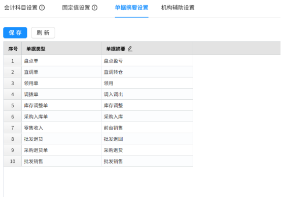 - 说明:设置每种单据的摘要信息!如果生成单据的方式为“按单据产生”则会将单据号信息附加在这里的摘要信息之前出现在凭证中。