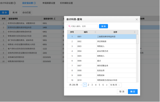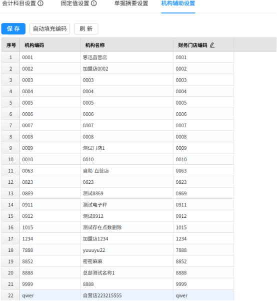 说明:此页面设置saas系统中的门店与财务软件中的门店对应关系,如果两边时一致的,可直接自动填充编码。