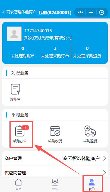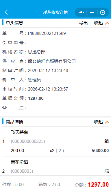 - 说明:供应南手机端进入思迅云链小程序–>我的–>采购业务–>采购收货,即可查看自家的采购收货明细。