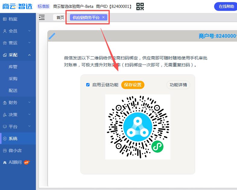 SCRM云链 · 采购收货在智选后台给对应的供应商做 采购收货,单据保存审核后,供应商在思迅SCRM云链小程序上即可查看采购收货明细。