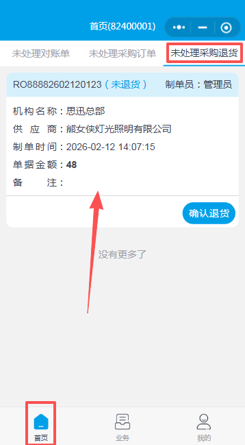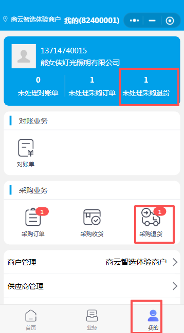 - 供应商手机端进入思迅云链小程序,处理未退货的单据。在云链系统中有两处可以查看未处理的单据,分别是首页:未处理采购退货、我的-采购业务·采购退货。