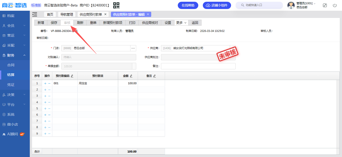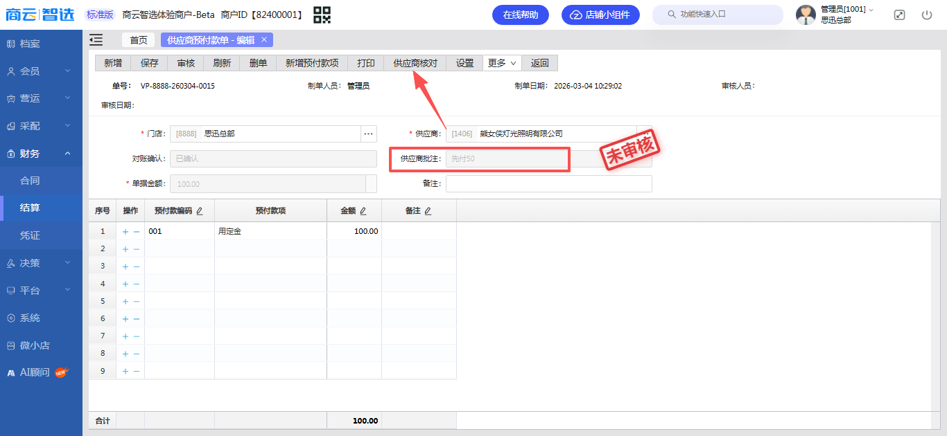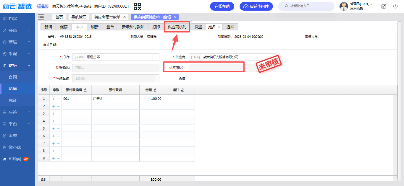 - 菜单位置:智选后台 ->【财务】->【结算】->【供应商结算】->【供应商预付款单】