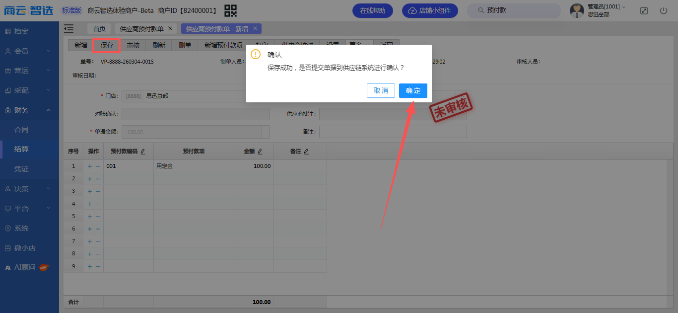 一、(商家)- 智选后台- 创建【供应商预付款单】