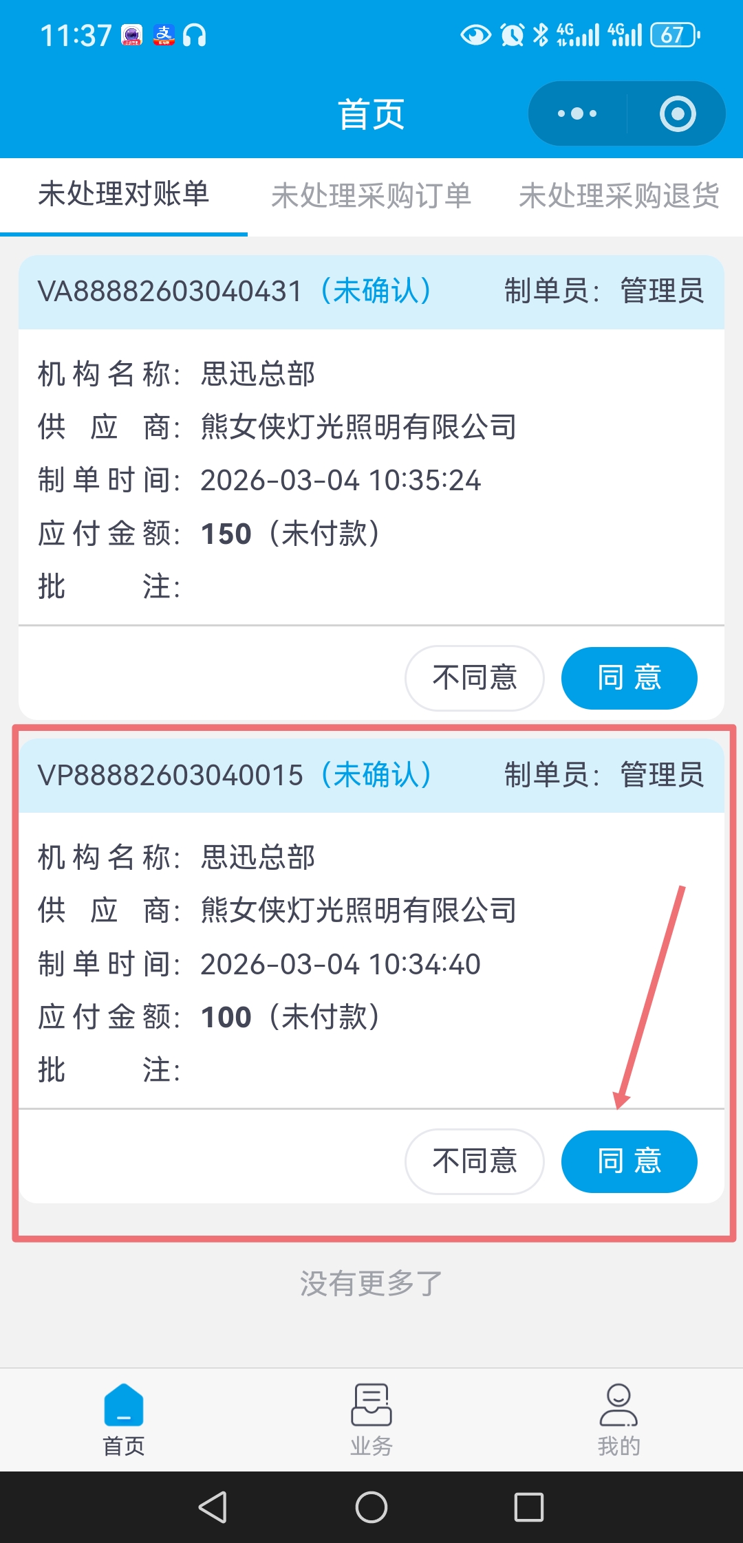 - 确认流程:进入云链小程序–>点-“我的”-“未处理对账单”–>看单据详情–>或者直接在单据里点:“不同意”/“同意”