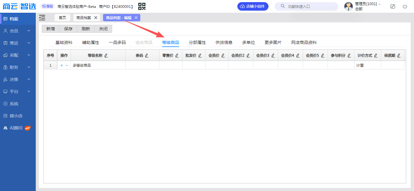 | 多等级商品 | 1:1比例销售计算商品库存,如整猪入库称重入库;按照部位销售,在一个档案上维护,如设置了三级,做调价时录入一个可带出三个商品。 | 主商品管理库存;明细商品不管理库存 | 主商品设置为自动转货,管理库存;明细商品设置为普通商品,不管理库存;