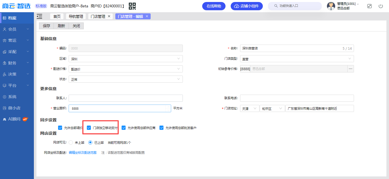 - 位置:智选后台–【档案】–【门店管理】,勾上“门店独立移动支付”,保存后,再回到思迅Pay里设置即可。