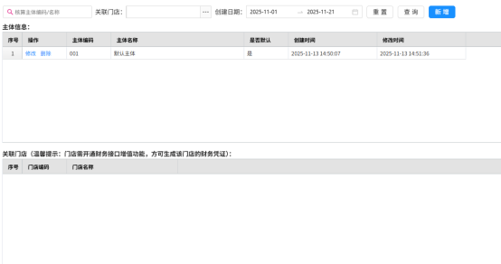• 说明:系统默认分配默认主体。当商家的连锁门店有多个主体(营业执照)时,可以通过此页面新增主体并关联相关的门店。